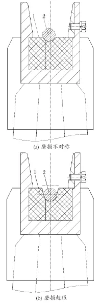 天輪裝置在返廠修復(fù)時,天輪襯墊磨損一般出現(xiàn)2 種情況 (見圖 9),襯墊磨損左右不對稱和襯墊深度方向磨損超限。分析其原因:襯墊左右磨損不對稱是因?yàn)樘燧喲b置與主軸裝置不對中所致;襯墊磨損嚴(yán)重直接原因是鋼絲繩與襯墊發(fā)生了相對運(yùn)動,鋼絲繩打滑,輪緣偏擺較大也是原因之一。