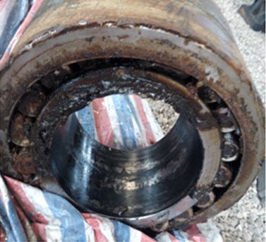 返廠修復(fù)的天輪裝置軸承座打開后,發(fā)現(xiàn)內(nèi)部多為脂水混合物,軸承內(nèi)部銹蝕嚴(yán)重,如圖8所示。在正確使用、維護(hù)及時的情況下,軸承不應(yīng)出現(xiàn)這種問題,其原因是:軸承座端蓋密封年久老化,在露天雨水的沖擊下,雨水從失效的密封處進(jìn)入軸承座內(nèi)部,使得軸承潤滑不良,在重載條件下造成軸承磨損銹蝕。