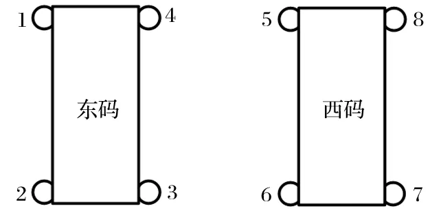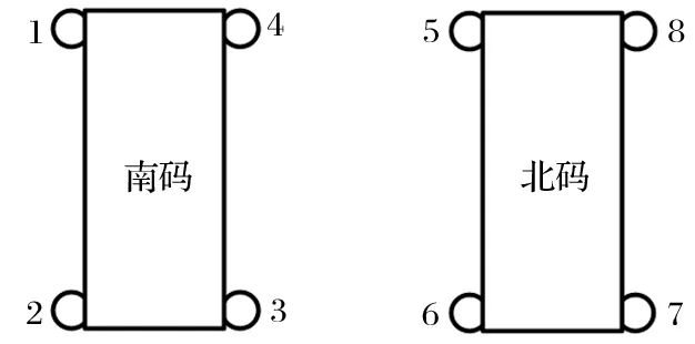 東西兩碼罐籠各有 4 根、共 8 根鋼絲繩罐道,罐道繩的分布如圖5 所示,圖中 1~8 號為罐道繩,下同。測試結果如表2 所列。