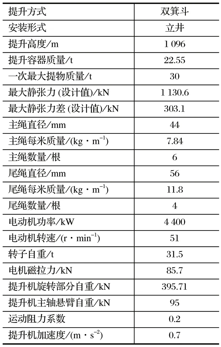 本研究以某礦 JKM-4.5×6PⅢ多繩摩擦式提升機(jī)為例,該提升機(jī)由中信重工機(jī)械股份有限公司設(shè)計(jì)制造,其系統(tǒng)參數(shù)如表1 所列。主軸傳動(dòng)側(cè)采用 FAG雙列調(diào)心滾子軸承,軸承型號(hào)為 240/1060BK30.MB(FAG),軸承當(dāng)量動(dòng)載荷 Cr=18 600 kN,e =0.27,Y=2.47。