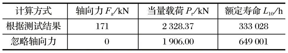 根據(jù)傳統(tǒng)方法得到軸向力為 0 kN,測(cè)試方法得到軸向力為 171 kN。按照軸承壽命計(jì)算公式,利用兩方法分別計(jì)算,其結(jié)果如表2 所列。